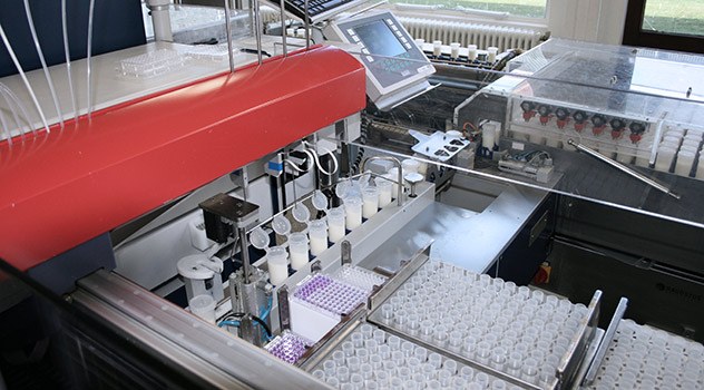 Throughout the laboratory there are conveyor belts ferrying milk samples to and from analysis instruments. Rows of plastic vials are lined up like soldiers on parade, marching neatly towards the waiting analysers that are capable of handling hundreds of samples per hour.